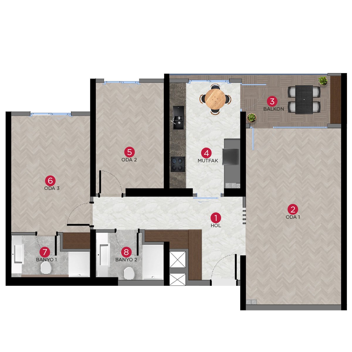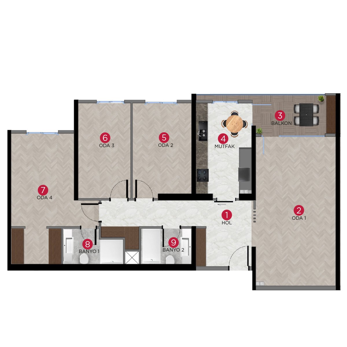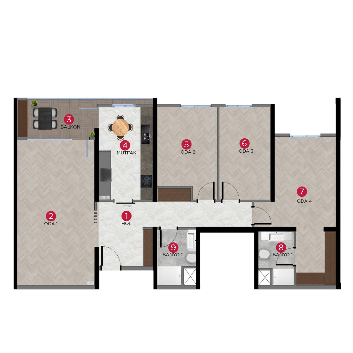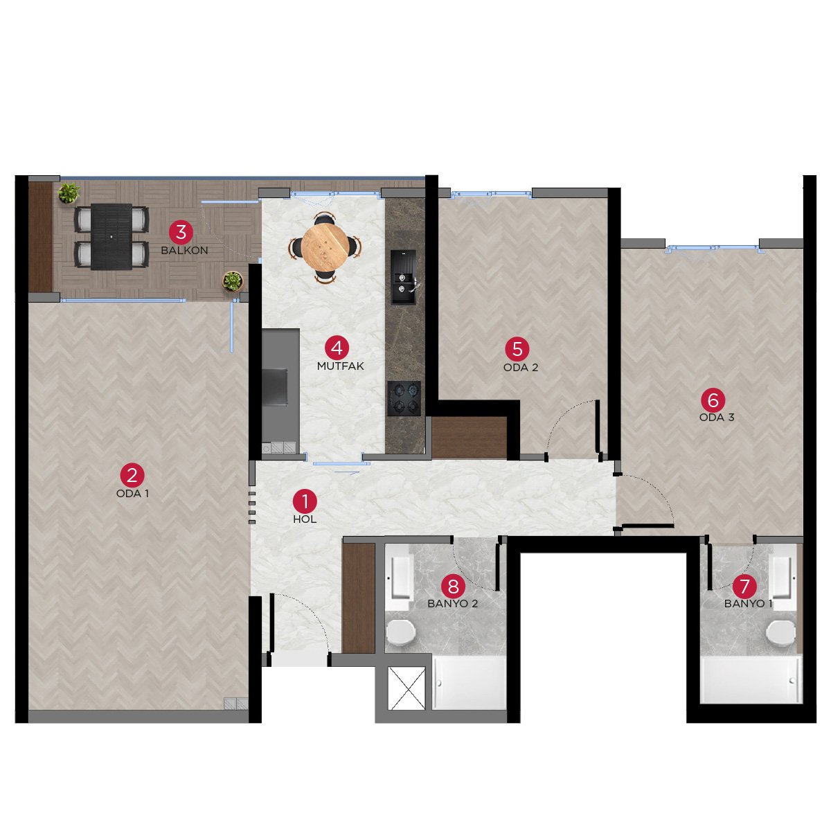 Tüm planlarda geniş giriş alanı, bağımsız mutfak, gömme dolap alanları düşünülmüştür. 3+1 projemizde 2 banyo bulunmaktadır. Hem yaşam alanı hem de mutfaktan giriş olacak şekilde planlanan geniş balkonda manzaranın tadını çıkarmanızı istedik.