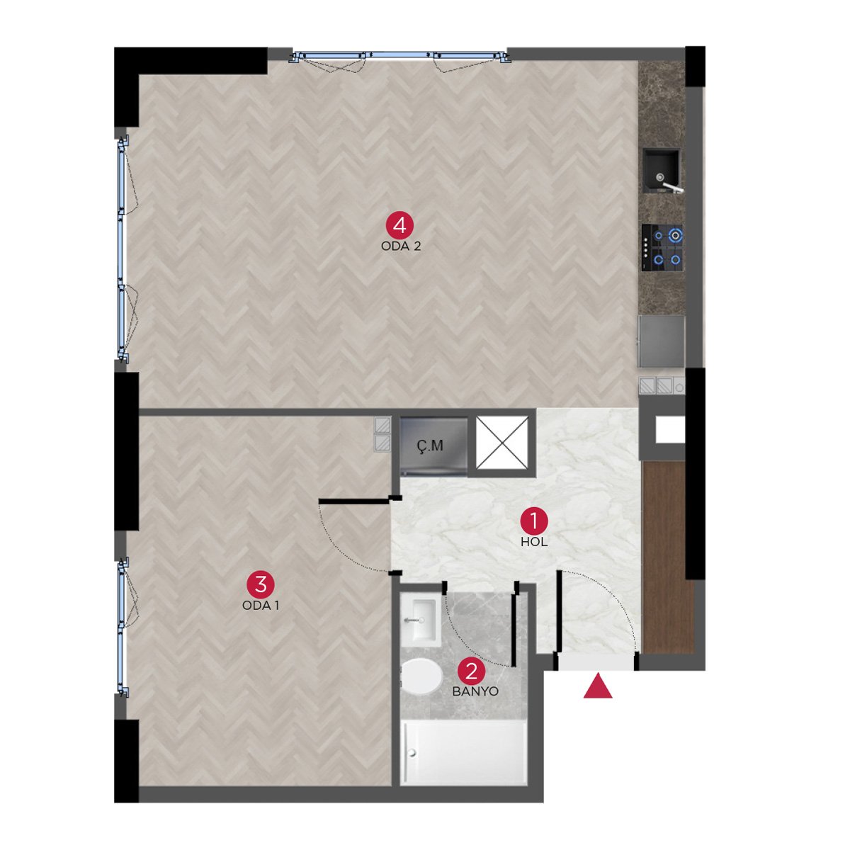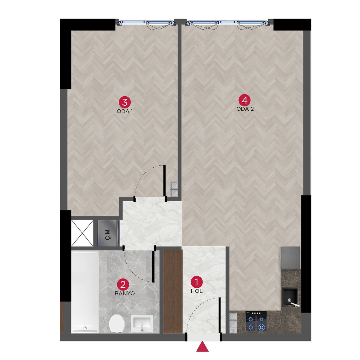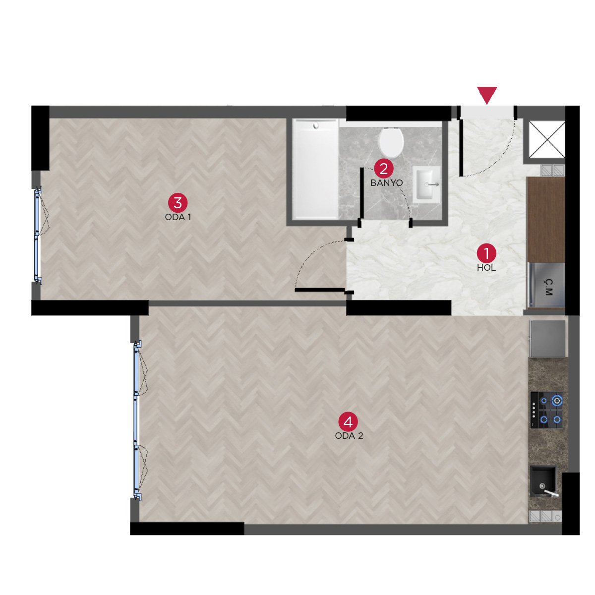 Tüm planlarda geniş giriş alanı, bağımsız mutfak, gömme dolap alanları düşünülmüştür. 2+1 projemizde 2 banyo bulunmaktadır. Hem yaşam alanı hem de mutfaktan giriş olacak şekilde planlanan geniş balkonda manzaranın tadını çıkarabilirsiniz.