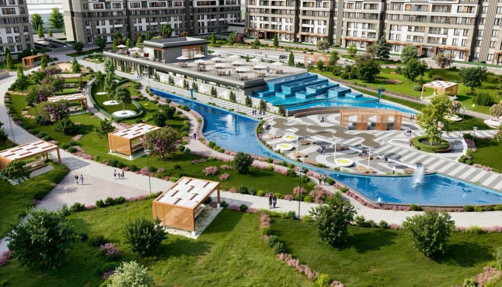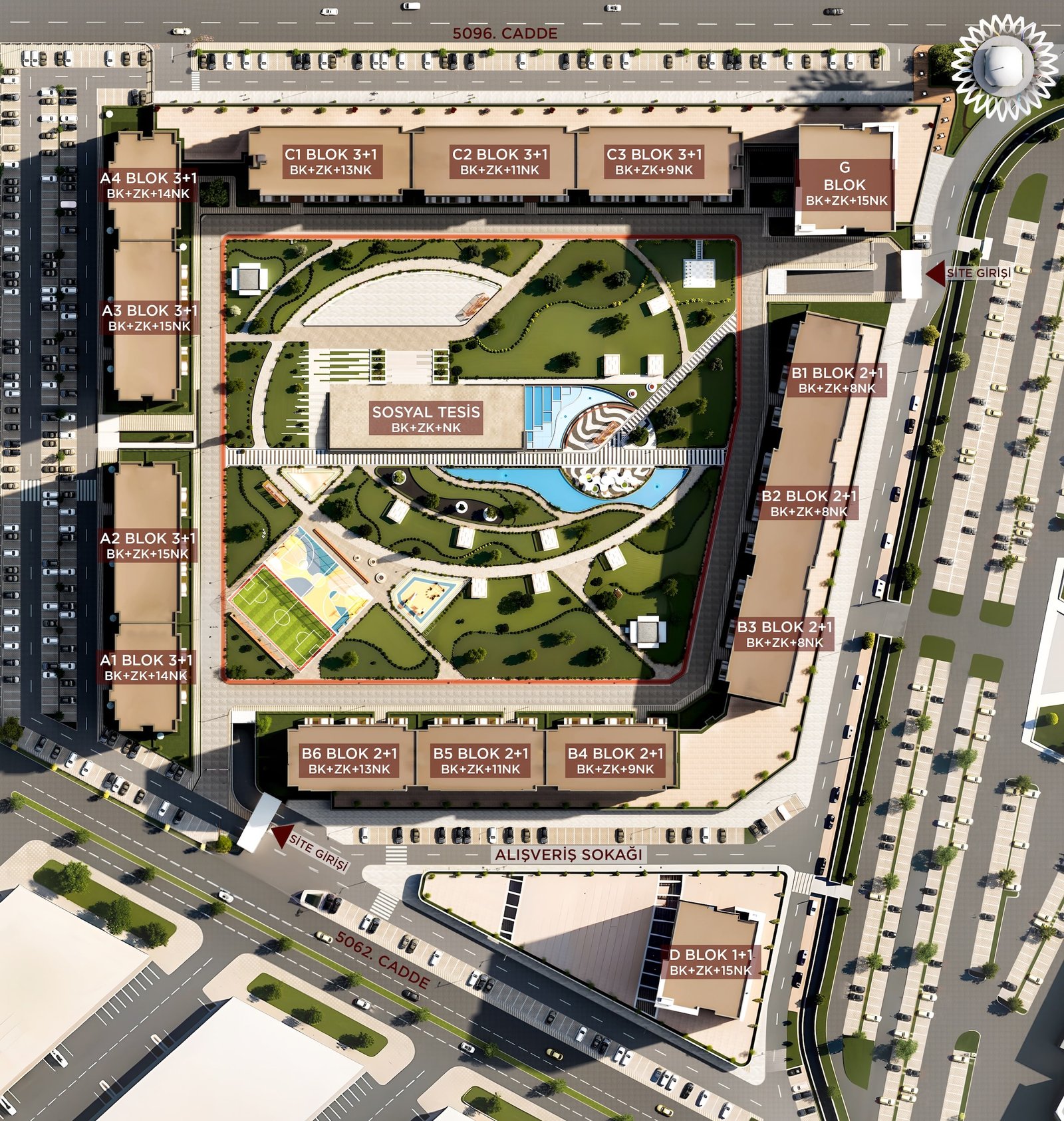 Peyzaj alanının hemen altında yer alan geniş otopark, sitenin iki farklı girişinden kolayca erişilebilecek şekilde tasarlanmaktadır. Bu düşünceli planlama, site sakinlerine zaman kazandırmakta ve araç güvenliğini en üst seviyede sağlamaktadır.