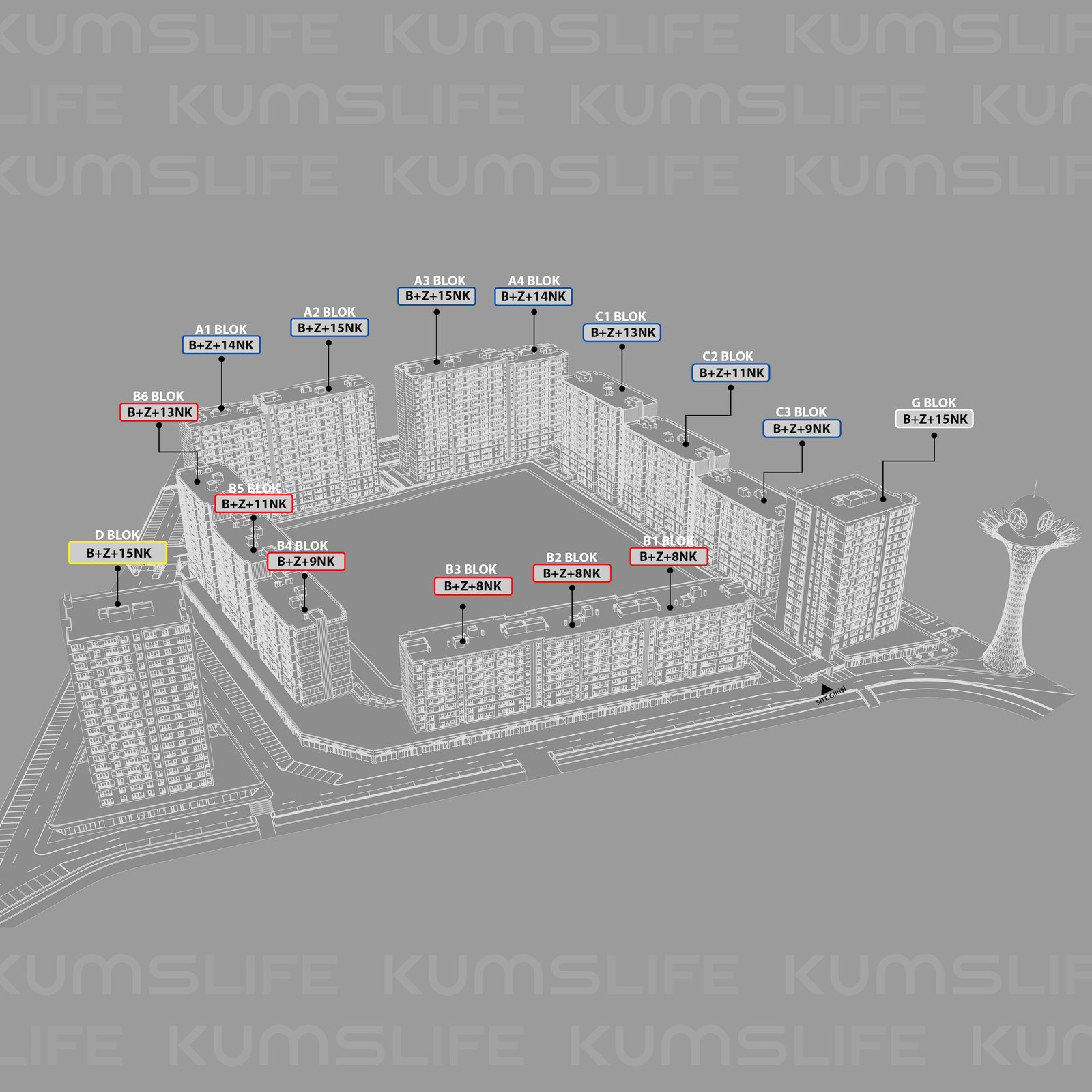 KUMSLIFE projesindeki bloklar, hem estetik bütünlük hem de fonksiyonel kullanım gözetilerek konumlandırılmıştır. Her blok, farklı yükseklik ve tipolojilerle projeye çeşitlilik katarken, yaşam alanlarının güneş ışığı, manzara ve ulaşım avantajlarından maksimum fayda sağlaması amaçlanmıştır.